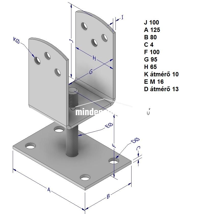 Oszloptartó, állítható menetes kivitelű , 3 mm vastag , melegen hengerelt lemezből, 65 mm széles, 100 mm gerendához. Sárga kromátozott felületkezeléssel.